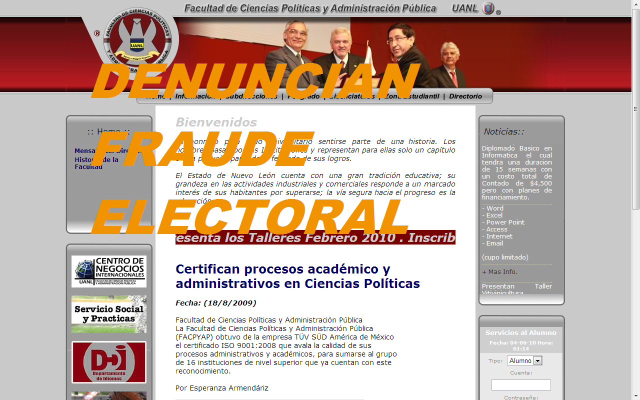 Monterrey, N.L.- (2 de junio) La periodista Ximena Peredo informó que alumnos de la Facultad de Ciencias Políticas de la UANL están levantando la voz ante lo que consideran un fraude electoral en las elecciones del 19 de mayo para elegir mesa directiva 2010-2011.
